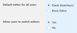 – Allow users to switch editors: Bu bölüm kullanıcıların editörler arasında geçiş yapabilmesini sağlar. Sitenizde bulunan diğer kullanıcıların istedikleri zaman Gutenberg editörüne geçebilmelerini istiyorsanız Yes olarak işaretleyin. No yalnızca Klasik düzenleyicinin kullanılabilmesini sağlar.